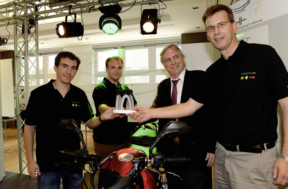 從左至右:來自布爾的馬丁查姆布倫(MartinChambrion)和詹斯蘭格齊(JensLanganki)憑借關(guān)于摩托車新離合器的創(chuàng)意獲得了今年的靈感大獎。舍弗勒集團副首席執(zhí)行官兼首席技術(shù)官彼得古茲默教授和離合器壓盤產(chǎn)品開發(fā)總監(jiān)克里斯托弗惠特曼為其頒獎。
